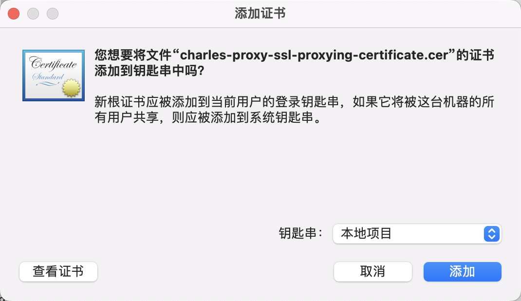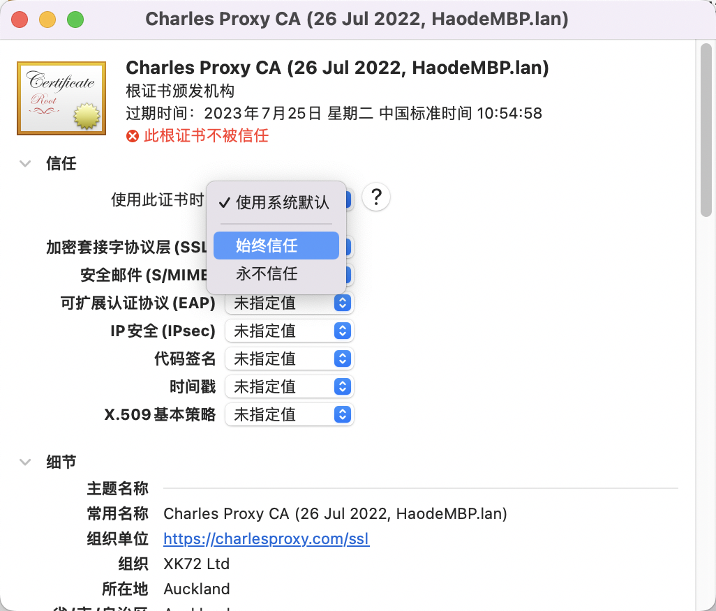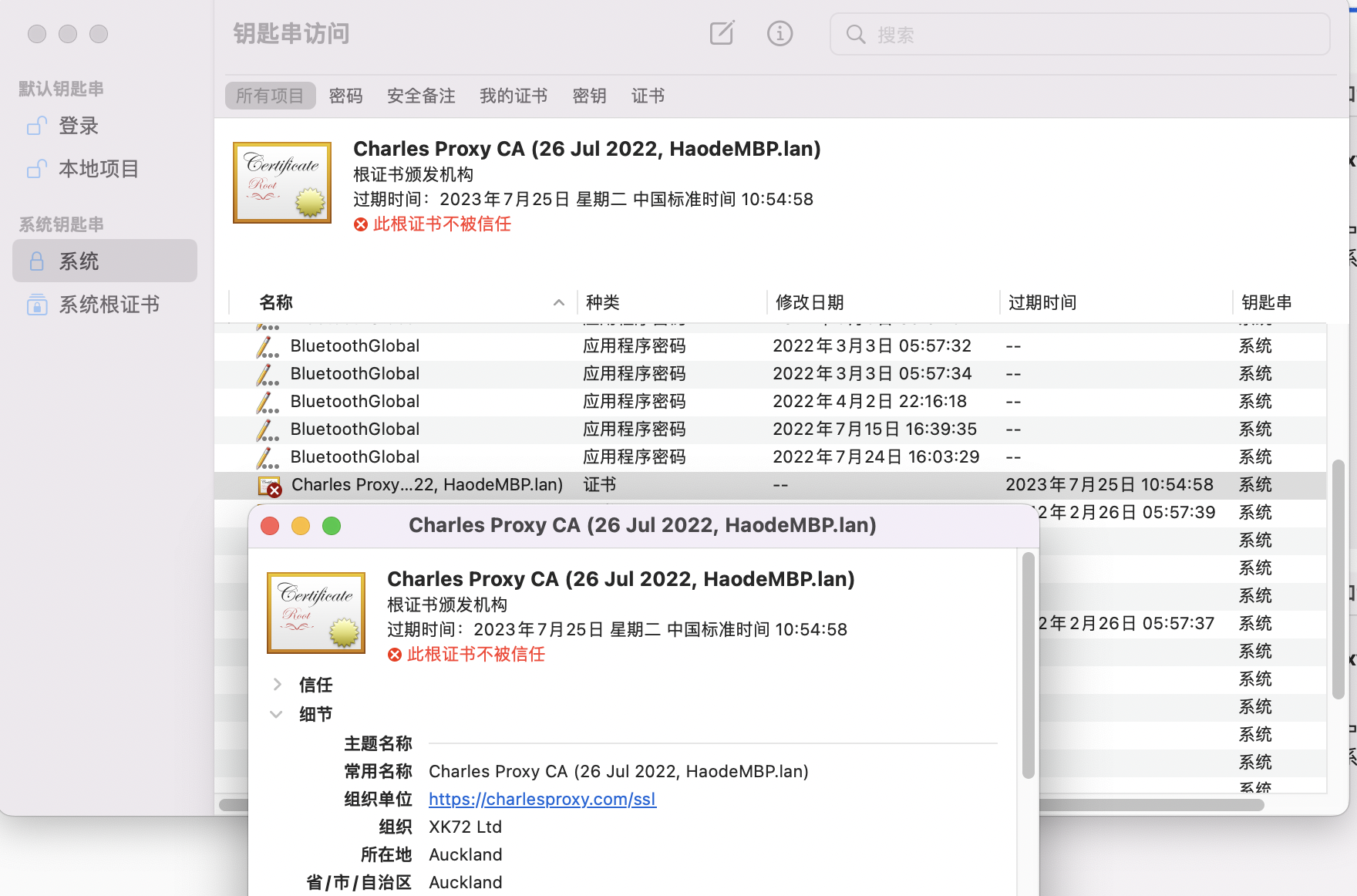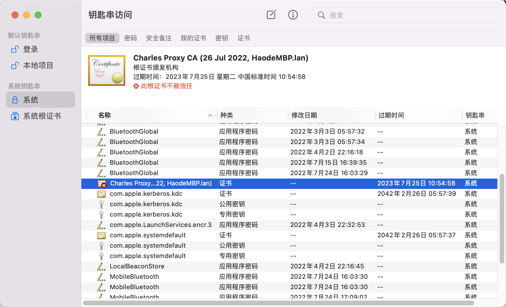 选中对应钥匙串,查看刚刚添加的证书,并双击信任
