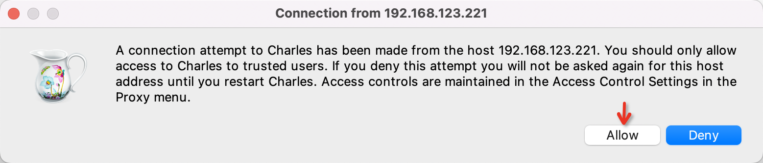 这个时候手机访问网络,在电脑的charles上会弹出是否允许连接,点击白色的允许