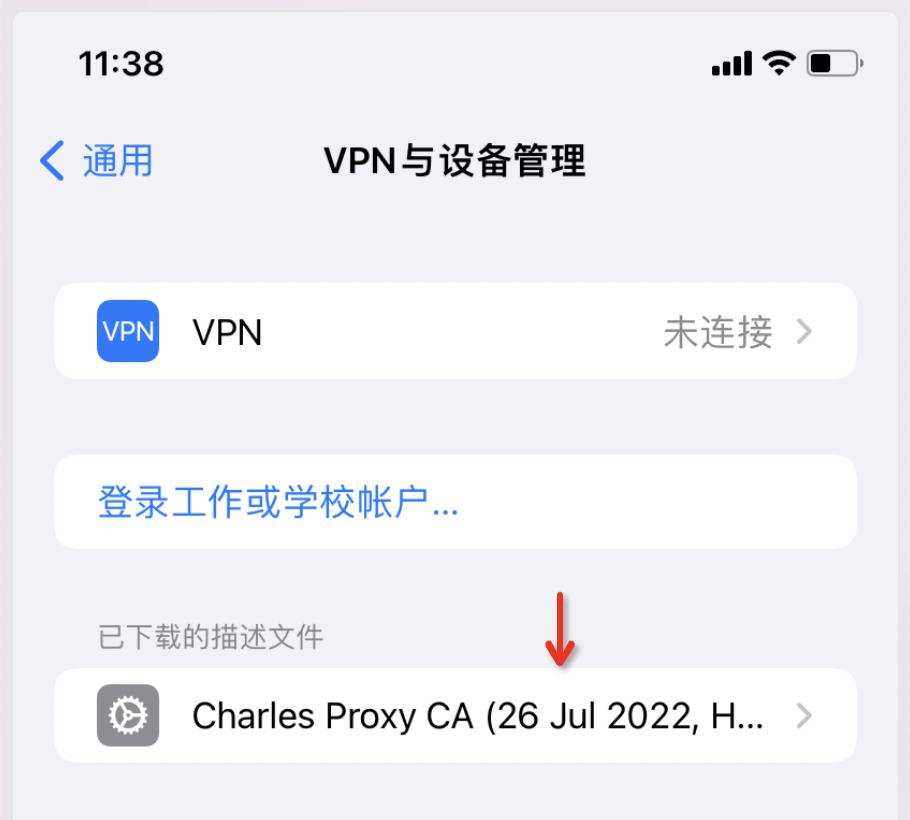 点击设置->通用->VPN与设备管理,点击刚刚安装的charles描述文件,选中安装